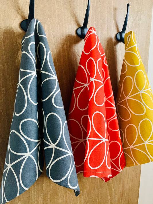 Retro Grey Red Yellow Tea Towels, Orla Kiely Fabric, Set of 3, Singles, Handsewn, Choice of colours Mid Century Scandi Print