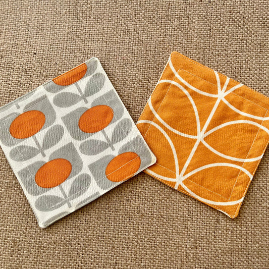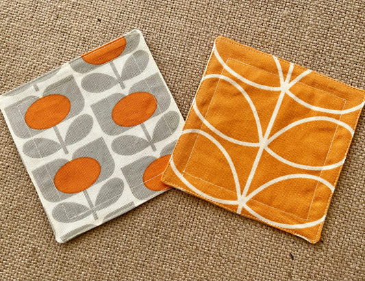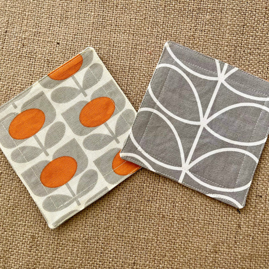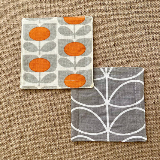 Retro Grey & Orange Coasters x 2 - Silver Stem, Set of Double-Sided Cotton Coasters Scandi Print Orla Kiely